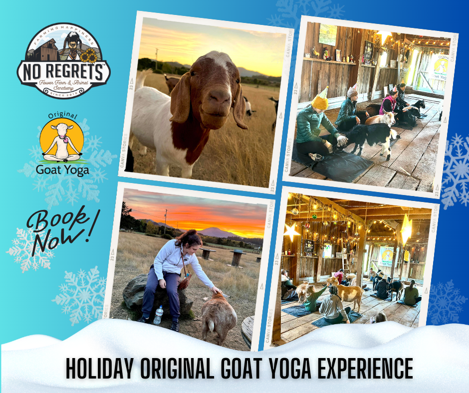 Join us for happy distractions and Holiday Goat Yoga followed by Goat Happy Hour with delicious hot cider. Let it all Goat while making forever memories! Part Yoga, Part Animal Assisted Therapy, and Part BEAUTIFUL views! Goat Yoga is about disconnecting from day to day stress, illness or depression and focusing on happy vibes! No yoga experience is needed.